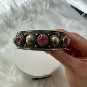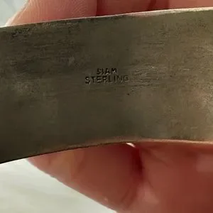 A beautifully crafted vintage Siam sterling silver cuff bracelet adorned with intricate repoussé detailing, highlighted by a bold domed bead design and framed with classic Thai wave and floral motifs. A fine representation of mid-century Siamese silversmith artistry and cultural heritage.