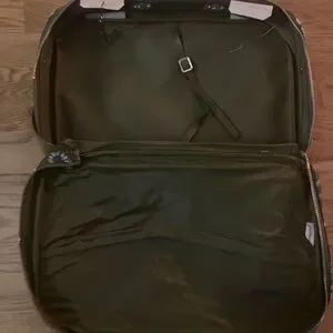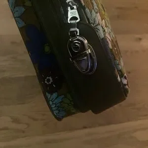 Stylish suitcase with a vibrant floral pattern. Features a mix of blue, green, and brown flowers.