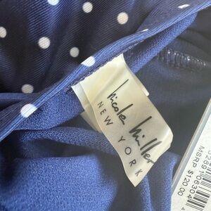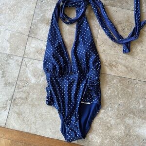 Can be worn six different ways blue with white polkadots side ruching for a flattering look retail $120 navy blue with white polkadots