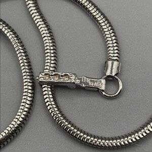 Leo Glass Company was founded in 1928 in New York and was known for high quality jewelry using the best crystals and Czech glass and sometimes Sterling . The company closed its doors in 1957. This necklace is pristine having sat in someone’s jewelry box for decades. It’s definitely rhodium plated as the back is buttery smooth. A nice snake chain with fold-over clasps. There were no rhinestones in the clasp as there is no glue residue there on. The large teardrop and two upper baguettes are a nice light yellow color (yes this is the try stone) while the others are clear. All prong set. Simple and elegant necklace from the past. Measures 14-1/2 not including the clasp. A very small neckline is required for the proper drape (11-13”) max.