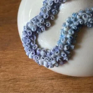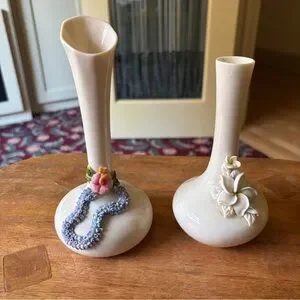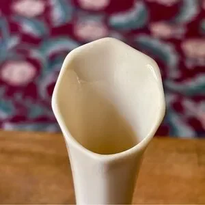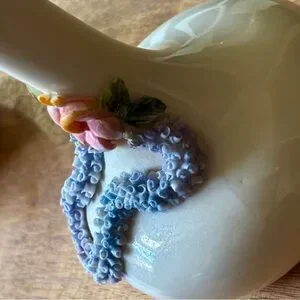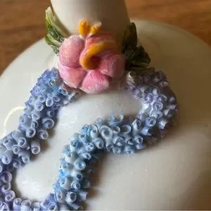 It is made of white porcelain and features hand-sculpted Ginger buds forming a draping blue lei, accented with a beautiful pink hibiscus. What makes this piece unique are the brightly colored flowers. The pieces I have seen with raised flowers are totally white, with a faint hint of yellow in the center of plumeria flowers - which usually are the same color as the vase. I have one of those vases also, and have included a photo of the two vase’s together for your reference.