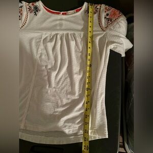 Chic white top with colorful floral embroidery. Features short puff sleeves. Perfect for casual outings.