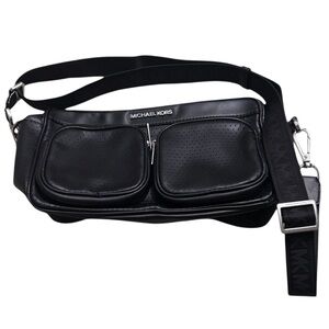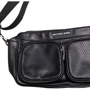 Sleek black shoulder bag. Features perforated design. Adjustable strap. Please see All Pics! This bag looks like it has gold hardware but the strap looks like it’s silver hardware! I just got this bag off of Poshmark it was not a bag of my own so I could be wrong about the hardware being 2 different colors!