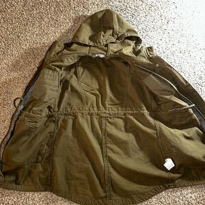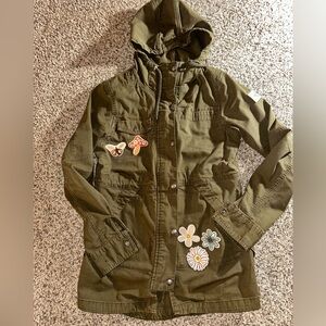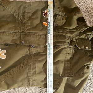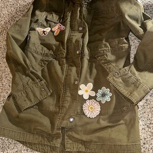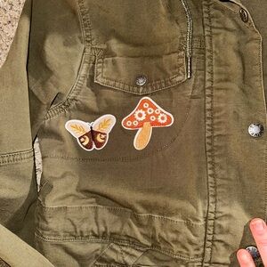 Stylish olive utility jacket with charming floral patches. My favorite jacket to packet for vacations, collect eggs on a cold morning from the coop. Moving on and moving up for me. Please keep this lovely jacket alive.