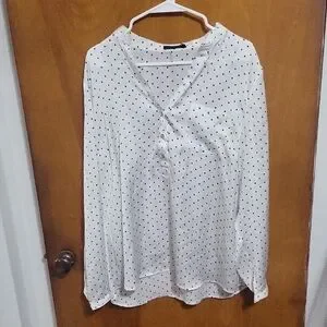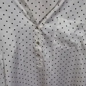 Has a satin type feel, shiny look. Three buttons and v neck top. Has 1 breast pocket.