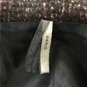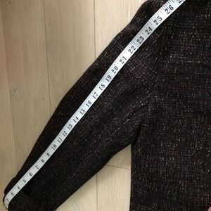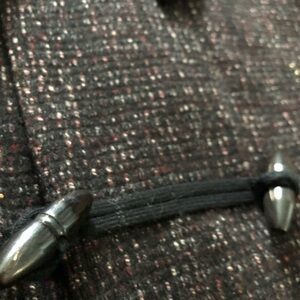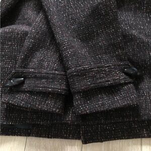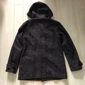Marled speckled 100% wool hooded short coat. Wooden tassel button closure/sleeves.