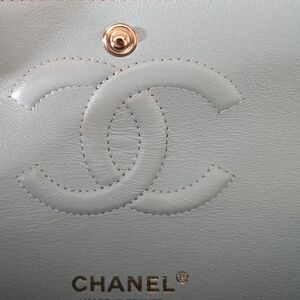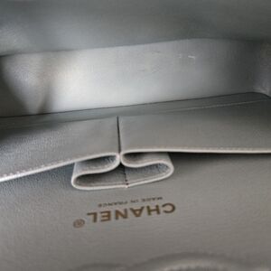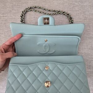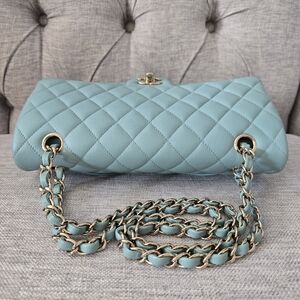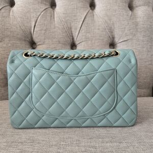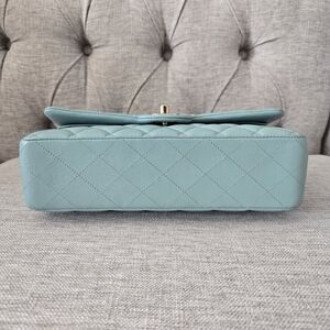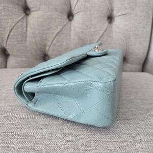 100% Authentic Chanel Medium Classic Flap in Tiffany Blue Caviar with light gold hardware. Lightly used condition, light hairline on the hardware, small makeup scuffs inside the bag.