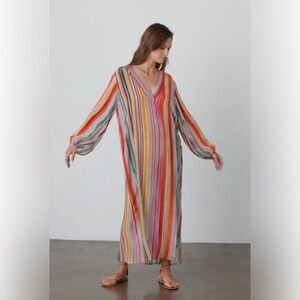 Vibrant maxi dress with multicolor stripes. Features a V-neck and long sleeves.