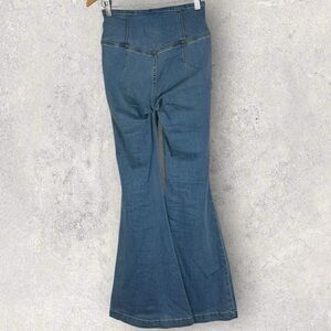 Free People x We The Free Venice Beach Flare Stretch Denim Jeans in Women's Size 24. Pull-on style with criss-cross waist. Style # OB1347763. 53% cotton, 23% viscose, 22% poly and 2% elastane. Made in China. Machine washable. Great pre-owned condition, minor wear near hem. Please review all photos.