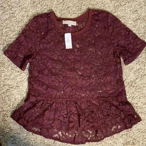 Loft Romantic Boho Business Causal Red Short Sleeve Floral Lace Women’s Top SzM