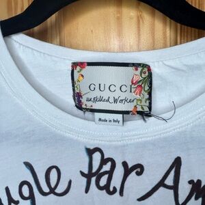 Authentic Gucci x Unskilled Worker collaboration “The Stein Sisters” white cotton graphic T-shirt. Features Unskilled Worker’s iconic illustrated artwork with florals, butterflies, and dogs, paired with the handwritten “L’Aveugle Par Amour” script across the front. A highly collectible piece that blends luxury fashion with contemporary illustration.