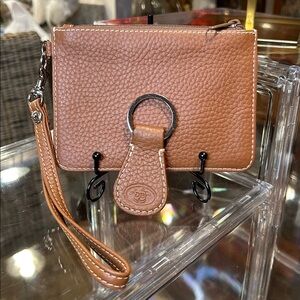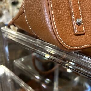 Dooney & Bourke camel leather satchel bag is perfect for any occasion. Its sleek design and high-quality material make it a must-have accessory. The matching pouch & key fob adds convenience and style. Slight wear on bottom corners.
