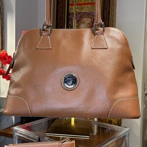 Dooney & Bourke Camel Leather Satchel with Mini Pouch & Key Fob 14”x 10” EUC