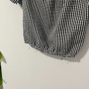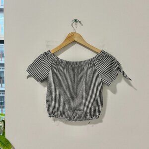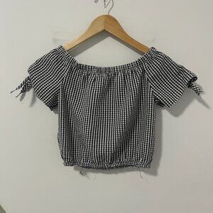 Aqua Black & White Gingham Print Crop Top Size Medium. Elasticized neckline and hem. Cute tie/bow detail on sleeves. Short Sleeve. Can be worn off the shoulder or regularly. Lightweight, stretchy material.