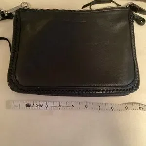 Sleek black crossbody bag. Features soft black pebbled leather and braided edge detailing with fun tassels. Two full zipper compartments and one open compartment for great versatility. A very long adjustable strap for comfort.