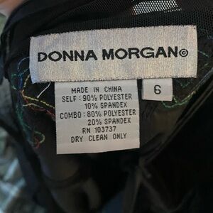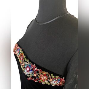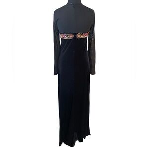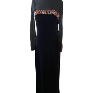 Absolutely breathtaking vintage floor-length dress from Donna Morgan, size 6. Black velvet skirt with sheer high neck, sheer long sleeves, and multicolored jewels and beads. Some stretch to bottom section, incredibly soft and comfortable for any dressy occasion. Zipper back.