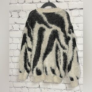 Cozy and stylish fuzzy sweater. Features bold black and cream pattern. Perfect for layering. 70% Polyester & 30% Acrylic. Pet and smoke free home.