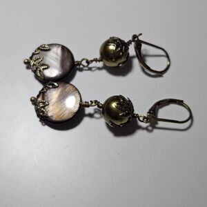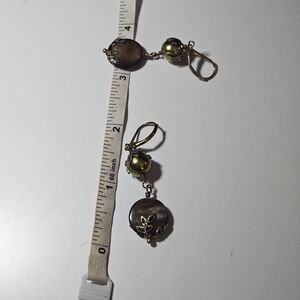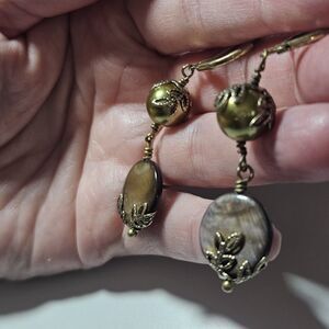 Gold Tone Dangling Green And Brown Beaded Earrings
