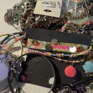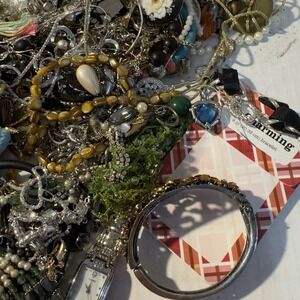 Assortment of mixed jewelry including a lot of bling. Some of it is actually wearable some of it is meant to be repurposed. Might need cleaning You'll be getting 4 pounds