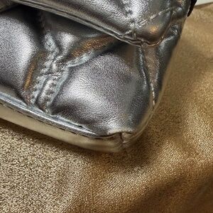 Beautiful crossbody bag in metallic silver color, very shiny. inside has a credit two card pockets, slit pocket. One exterior snap pocket. Adjustable strap.