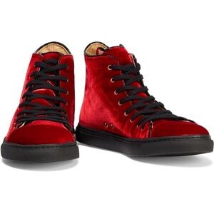 These Charlotte Olympia “Purrfect” high-top sneakers are crafted from luxurious red velvet and feature embroidered cat faces 🐱. Designed with a lace-up front and a rubber sole, they combine style and comfort 👟.