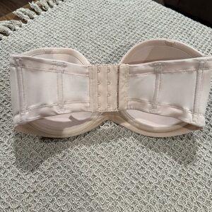 Experience unparalleled comfort and support with this Wacoal strapless bra, designed in a sophisticated cream hue. Its seamless design and lightly padded cups offer a smooth, natural silhouette with any outfit. Enjoy its elegant matte finish for a flawless look. This bra is strapless. In excellent condition.