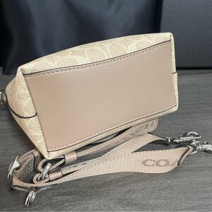 Chic Coach mini bag with signature pattern. Features tan hues and silver accents. Perfect for stylish outings.