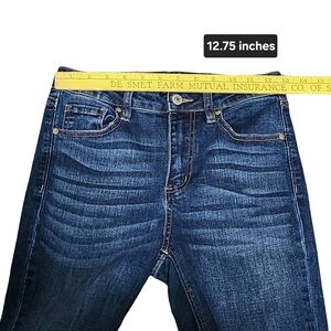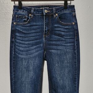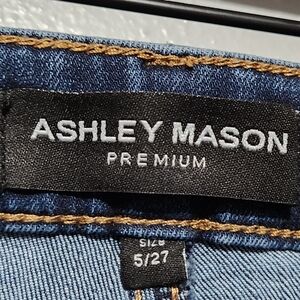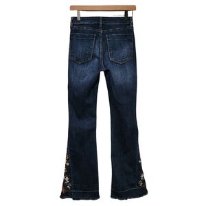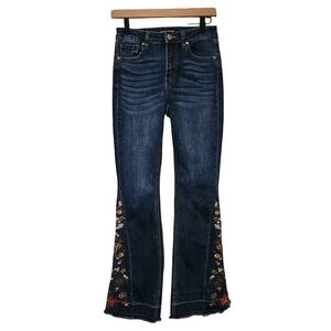 Pre-owned ASHLEY MASON womens juniors bootcut jeans in dark wash denim with embroidered floral hem detail. Size 5/27. Soft stretch denim with a flattering bootcut silhouette.