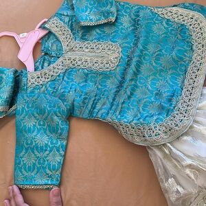 This elegant kids matching set features a beautiful teal top with intricate gold detailing and a cream bottom. Perfect for special occasions, this set combines style and comfort.
