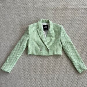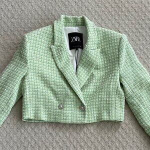 Zara Cropped Tweed Textured Jacket/Blazer Green Small NWT Office Academia Preppy