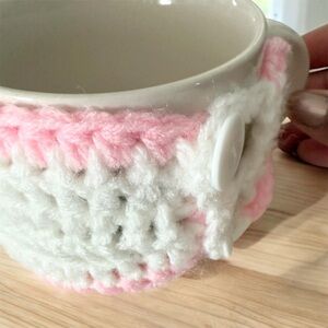 This beautiful, handmade crochet mug cozy (also known as a cup sleeve or warmer) is the perfect accessory for any coffee or tea lover. Featuring a lovely pink and white color scheme with an adorable heart appliqué, it's designed to add a touch of cozy charm to your daily routine while keeping your drinks warm and your hands protected.