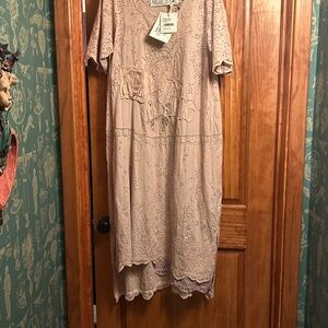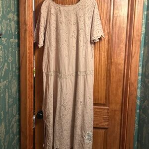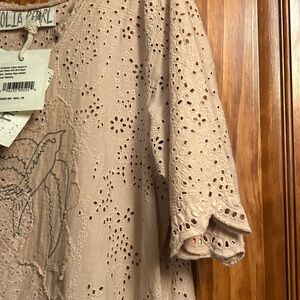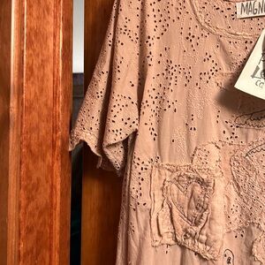 I bought this piece in Scottsdale at a little boutique to wear with some MP jeans that had pastel appliqués on them. The detail is really something special. It is a pinky peach color. covered in eyelet sleeves, bottom and sewn on in places. The waist has a delicate antique ribbon and 3 hand stitched black birds. It has the logo in the back at the bottom. Would look gorgeous on a tall Blonde. Could be used as a cover up too