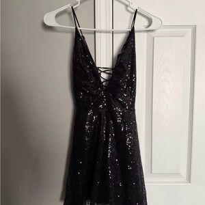 Sparkle in this sequin mini dress. Features a chic lace-up front. Ideal for evening events.