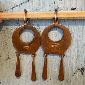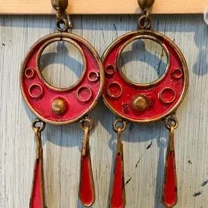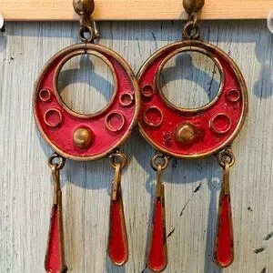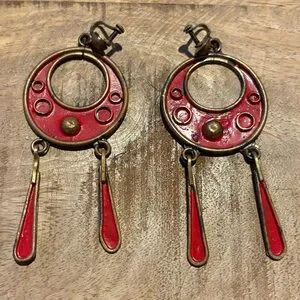 Add a bold touch to your outfit with these vintage red and gold dangle earrings. Made and purchased in early 1950’s in Mexico. The earrings are marked simply with “Mexico” on the back - see photos. They measure just over 3” long with dangles. The circle part measures 1-1/2” in diameter. Clip-ons. Perfect for any occasion.