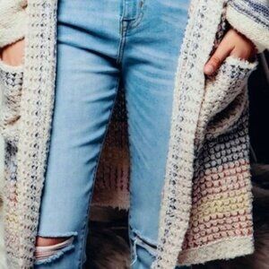 New Fall Arrival!✨ Staple layering cardigan. Features soft and lightweight knit material patterned with horizontal multi-colored stripes on bodice and blue stripes on long puffy poet sleeves. Two low side pockets, and a draped open front silhouette that falls into a straight knee-length hemline. Brand New!!!