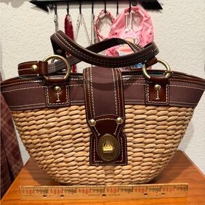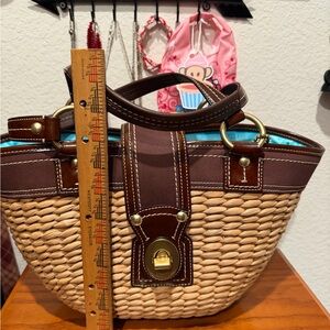 Stylish woven tote with leather accents. Features sturdy handles and signature Coach charm. Perfect for everyday use.