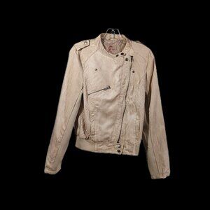 Mine Los Angeles lightweight full diagnal zipper short jacket is a stylish and versatile bomber style perfect for casual everyday use. Made from polyester with a rayon lining. The beige color and lightweight design make it ideal for the spring season.