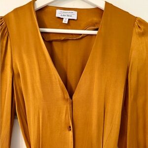Satin maxi dress with front button closures, an oval buckle waistbelt, and cuffed balloon sleeves. Deep v-neck Flared skirt Length of dress. Worn once for a concert.