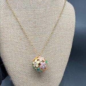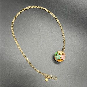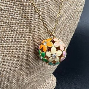 Add a playful yet elegant touch to your jewelry collection with this J.Crew pendant necklace, featuring a 1-inch spherical orb covered in colorful enamel flowers resembling daisies, each accented with sparkling clear crystal centers. The flowers’ vibrant colors pop beautifully against the gold-tone chain, creating a whimsical, eye-catching piece that’s perfect for both casual and dressy looks.
