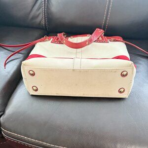 Gorgeous crimson and cotton colors, leather and satin details applied to canvas. In great condition - slight wear on shelf, barely used cotton canvas in great clean condition 14" x 13" x 3" with 10" strap. From the 2006 65th anniversary collection. some dirt stains are present - see photos for more details. Also note that there is no gold tags attached.