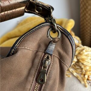 Stylish Chloe shoulder bag with bold gold logo. Rich brown fabric with elegant design.Canvas tote with bag charm on side zipper. Gold tone has worn off due to wear on the straps and corners of the bag showing in photos.