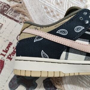 Features a bandana pattern on the upper, Combines black, beige, and pink tones.