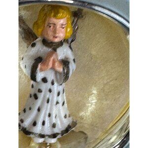 Sweet mid‑century glass diorama ornament, silvered look, with a tiny praying angel inside. The angel’s wings are spun cotton; cap is marked Made In Italy. No chips or cracks observed. Nice size for a display tree or hanging on a vintage‑style garland.