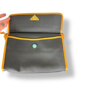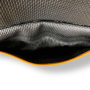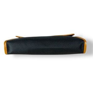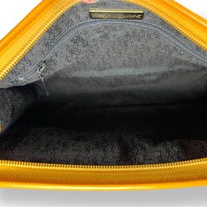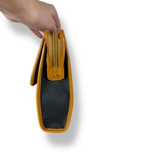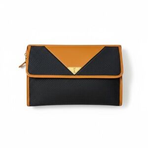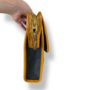 This stunner is a quiet luxury chic it girl staple. Can throw in larger bags, travel for make up or a clutch. Black woven material (I think pvc) for durability and easy cleaning with a beautiful butterscotch tan brown leather detail and envelope style detail. Zip closure with two buttons on sides to keep zipper tab secure. Gold metal hardware detail with iconic “YSL” on the front plate and zipper Logo Jacquard Lining with pocket and magnetic flap slip pocket