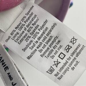 Features lilac floral print, tiered ruffles and striped waist detail.