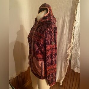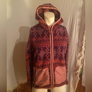 Cozy Burton jacket with a hood. Features a pink and purple Aztec geometric design.