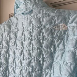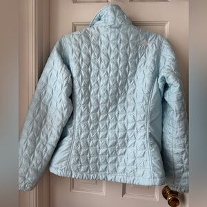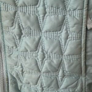 Stylish geometric quilted design. Full zip closure. Zippered pockets and interior Velcro pocket. Elastic cuffs and cinch-cord at hem. Warm without being puffy. Good, used condition. Some signs of wear on sleeve cuffs and collar as shown.