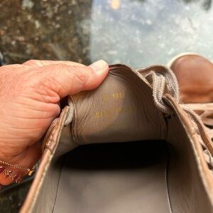 Woven leather lace up sneakers. Great for everyday or work. These have only been worn a couple times. Very little wear on bottom. Very minor scuffing on soles. There is some variation in leather color on toes. Likely this is natural variation in natural leather. See pics for documentation. Overall these are in excellent condition. Brown laces