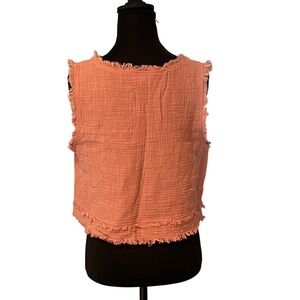 Size Medium. Excellent condition. Loveriche peach gauze v neck crop top. This sleeveless top features a textured gauze fabric with a raw fringed hem and neckline. The relaxed fit and breathable material make it a comfortable and stylish choice.