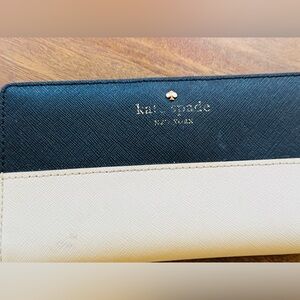 Elegant clutch with a sleek black top and cream base. Features gold logo detail.